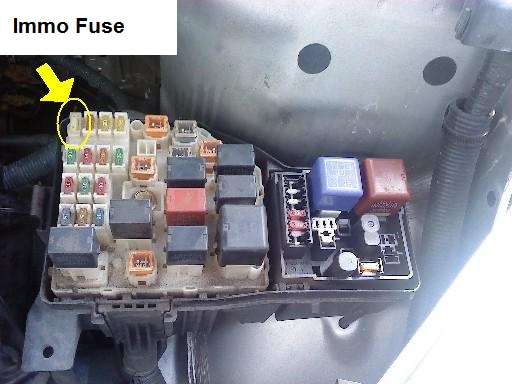 Lift the cover of the plastic box (fuse box) by depressing a clip on the front side of it. You will see something like in the picture below (probably with less dirt). In that picture, you can see a red arrow pointing to the location of the fuse we are referring to. When you see the layout legend in the reverse of the fusebox cap, you will notice that it is the only fuse that has no reference. I won’t say “immobilizer” or anything because it is part of the vehicle’s security system when installed.
